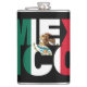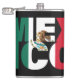 Stylish flask features Mexico spelled out with large stacked letters that have the country's national flag as fill, with black background.