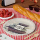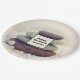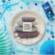 Paper plates with a photograph featuring rocks stacks on top of each other. Surrounded by loose white rocks and little white flowers.