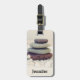A luggage tag with a photograph featuring rocks stacks on top of each other. Surrounded by loose white rocks and little white flowers.