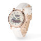 A watch with a photograph featuring rocks stacks on top of each other. Surrounded by loose white rocks and little white flowers.