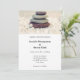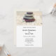 Wedding invitation with a photograph featuring rocks stacks on top of each other. Surrounded by loose white rocks and little white flowers.