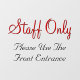This elegant design features the messages "Staff Only" and "Please Use The Front Entrance". It might be used by a business to alert customers and visitors to use a different entrance.