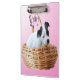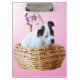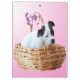 Pictured in a basket is a black and white Staffordshire Bull Terrier Puppy.