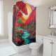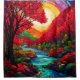 This vibrant artwork features a stunning stained glass style depiction of an autumn landscape. A river flows through the centre, flanked by trees with red and orange foliage, creating a warm and inviting scene. The background showcases rolling hills in shades of green, orange, and red, leading up to a bright yellow sun with radiating beams. The sky transitions from yellow near the sun to deep blue at the top corners, adding depth and contrast. The bold black outlines and colourful hues give the impression of a beautifully crafted stained glass window, making this piece a captivating addition to any space.