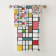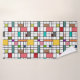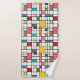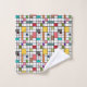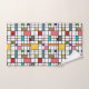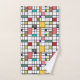 This towel set has a mid-century modern design of a grid of black lines with squares and rectangles in retro colours on a field of white.