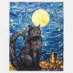 Reminiscent of Vincent Van Gogh's Starry Night, this black cat relaxes against a starry night cityscape.
