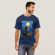 Reminiscent of Vincent Van Gogh's Starry Night, this black cat relaxes against a starry night cityscape.