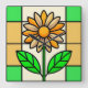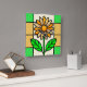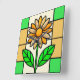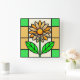 a stained glass window illustration of a yellow and white daisy with green leaves.