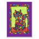 This unique and colourful cat sits against a spring green background and gazes at the viewer, showing off her multi-coloured mosaic-like markings that resemble stained glass. The entire scene is surrounded by a detailed multicolored border that matches her markings.
