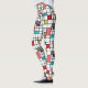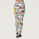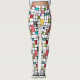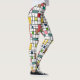 These leggings have a mid-century modern design of a grid of black lines with squares and rectangles in retro colors on a field of white.