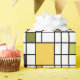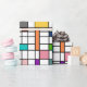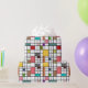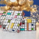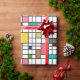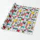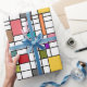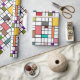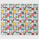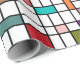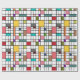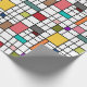 This wrapping paper has a mid-century modern design of a grid of black lines with squares and rectangles in retro colours on a field of white.
