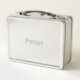 This Stainless Lunch Box is a grey colour. The name Peter is on the lunch box on the front and back. The name is in silver text. You can change the name with the Personalise button.