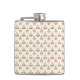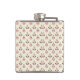 "Stainless steel flask with a pattern of small, stylized red and green floral motifs on a white background. The design is featured on both the front and left sides of the flask."