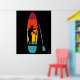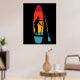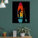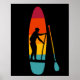 This poster features an illustration of a SUP or stand up paddle board and paddle depicted in vibrant sunset colours with a silhouette illustration in black of someone paddle boarding. The graphic is set against a black background.