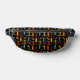 This patterned fanny pack features illustrations of paddle boarders and paddle boards in rust red, orange, yellow and teal blue set against a black background.
