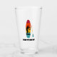 Create a personalised gift that's perfect for stand up paddle boarders. This pint glass or pub glass tumbler features an illustration of a SUP or stand up paddle board and paddle depicted in vibrant sunset colours with a silhouette illustration in black of someone paddle boarding. Below the graphic is a spot below for adding a name in bold black lettering.