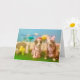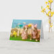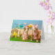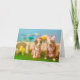 Humourous Easter card. 2 dogs in dresses, rabbit, chick, squirrel, large flowers, Easter eggs in background. The one dog says to the other one:
