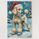 This stylized vintage illustration, inspired by 1950s greeting cards, features an elegant Standard Poodle in a continental clip, wearing a Santa hat while poised on an ice rink with a gift in its mouth. A sophisticated and charming holiday design.