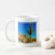 The photograph features a large multi-armed saguaro cactus by a hiking trail which leads towards a boulder strewn mountain in the Sonoran desert.