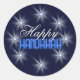 This beautiful sticker design features eight sparkling Stars of David in an array around the text 'Happy Hanukkah'. Background is midnight blue circled by white shining stars.