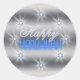 This beautiful sticker design features eight sparkling Stars of David in an array around the text 'Happy Hanukkah'. Background is a silver gradient circled by white shining stars.