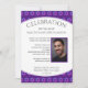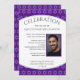 Modern purple Star of David CELEBRATION OF LIFE Photo Funeral invitation with PHOTO TEMPLATE and CUSTOMIZABLE text. There is a Scripture text based on 2 Corinthians 5:8. The background text says IN LOVING MEMORY in a tiled pattern. Other designs available. Matching Share A Memory card is also available.