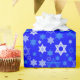 Wrap up your Hanukkah gifts with this paper that features the Star of David in a variety of designs and shades of blue and white on a blue background.