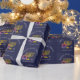 Stylish, elegant HANUKKAH BLESSINGS Wrapping Paper. Design shows a gold coloured MENORAH with multicolored STAR OF DAVID and silver grey DREIDEL. At the top there is curved text which says BARUCH ATAH, ADONAI (Blessed are You, O God) and underneath the text reads HANUKKAH BLESSINGS. The background colour is midnight blue. Matching items are available in the HANUKKAH Collection by Berean Designs.