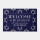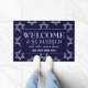 Stylish, Star of David WELCOME Door Mat with the wording WELCOME & BE BLESSED ALL WHO ENTER HERE (EXCEPT TRESPASSERS). The background is a faux silver Star of David against a midnight blue background. All text is CUSTOMIZABLE so you can amend the wording to suit your needs, eg. add family name, family motto, inspirational quote. Great gift for Hanukkah.