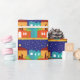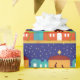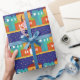 A modern folk art style design with a colourful city of Bethlehem. A silhouette of the holy family with Joseph and Mary overlooking baby Jesus in the manger. The evening sky is a beautiful dark blue with the star of the East shining above. Smaller stars surround the sky.