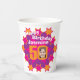 Personalise these bright 50th birthday party paper cups with your own birthday name and photograph in the 0 of 50 on both sides one for your photo now and one from your past. Fun star pattern and text and personalised photo design in bright pink and orange yellow. Ideal for using at a girls fiftieth birthday party. Other matching items are available. © Original graphic art and design by Sarah Trett for www.mylittleeden.com