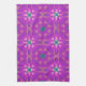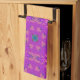 This towel's design reminds me of the 70's. It is a geometric pattern consisting of diamonds, circles, and squares in shades of purple. There are stars interspersed throughout the design.