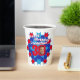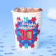 Personalise these bright 30th birthday party paper cups with your own birthday name and photograph in the 0 of 30 on both sides one for your photo now and one from your past. Fun star pattern and text and personalised photo design in bright red, cyan and royal blue. Ideal for using at a thirtieth birthday party. Other matching items and colour options are available. © Original graphic art and design by Sarah Trett for www.mylittleeden.com