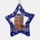 One side of this festive star shaped holiday ornament has your photograph framed in a pretty blue and silver faux glitter snowflake pattern. The other holds your own text in matching blue on a white star that is bordered with the same pretty snowflake pattern. Replace the sample photo with your own; use customise to move your photo into the best position for the star shape. *Please note - the image is printed and does not contain actual glitter.*