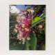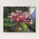 The beautiful image on this Jigsaw Puzzle is an original photograph by ZoeSPEAK of a flowering clerodendrum bush. This variety is called Starburst, because each bloom is made up of magenta stems bursting out, with little white flowers at their tips. The Starburst is surrounded by a cluster of green leaves and a tropical green background. This plant blooms at the end of winter, more reliable than a groundhog.