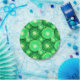 Digitally generated fractal starburst and pinwheel graphic in shades of pale mint to leaf green, accented with white, on a dark pine green background