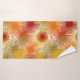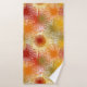 This towel set has a gamboge (gold) washcloth, a moss green hand towel, and a bath towel with a Boho design of starbursts in gamboge (gold), red, berry, and green.