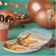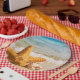 Paper plates with a cute photograph of a starfish positioned upright in the sand. Underneath it's arm is a little seashell resting comfortably. Set on a beach with waves crashing in the background.