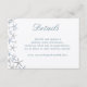 Wedding details card with starfish border. Text is light blue and is shown on upgraded champagne shimmer paper. Light blue and grey sea stars are “falling” down the left edge of small enclosure cards that have size selection.