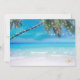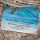 Destination beach wedding invitations featuring a tropical paradise beach setting with palm trees draped in string twinkle lights, two ocean starfish and a modern wedding text template that is easy to customise to suit any occasion.