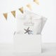 Two sea stars wedding thank you favour bags. Customise with names and wedding date along with a “thank you” message to guests. White bags have a brown and a blue starfish “couple” in the centre with brown text above and below the image. Sample thank you message is, “Thank you for being here at the beginning of our new adventure”.