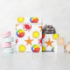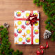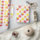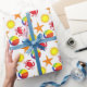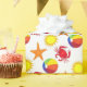 Gift wrap features an original marker illustration of a row of classic beach designs including a brightly coloured starfish, beach ball, crab, and sunshine. Great for summer celebrations!