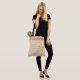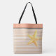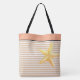 This tote bag is shown in a cute sand colour stripes and Yellow/Lt. Orange starfish print design and a Orange coordinating band at top with Black strap handles.