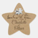 A charming beach scene featuring a starfish couple created from sparkling gemstones—one adorned with a veil, the other with a bow tie. The design includes sand-carved “Love” typography on a sandy background, personalised with the couple’s names. A sweet keepsake or gift sticker for beach weddings. Shown in a star-shaped design with additional shapes available.