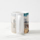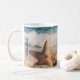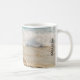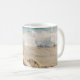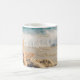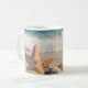 A mug with a scenic photo. A big starfish set upright on a sandy beach. A beautiful blue sea with waves of white surf in the background.