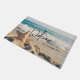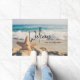 Welcome doormat with a scenic photo. A big starfish set upright on a sandy beach. A beautiful blue sea with waves of white surf in the background.
