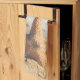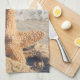 A kitchen towel with a scenic photo. A big starfish set upright on a sandy beach. A beautiful blue sea with waves of white surf in the background.