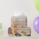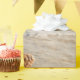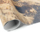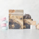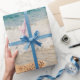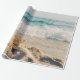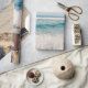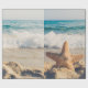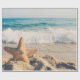 Wrapping paper with a scenic photo. A big starfish set upright on a sandy beach. A beautiful blue sea with waves of white surf in the background.
