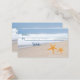 Lovely escort place cards for your casual beach summer wedding. It features a photo of a beach with blue water, white foam and beige sand and a pair of starfish on it. It is a great choice for your destination wedding table.