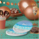 A beautiful photograph of a sandy white beach infused with a starfish and bubble graphic with crystal clear turquoise blue water and a sunny blue sky on which the bridal couples initials appear.